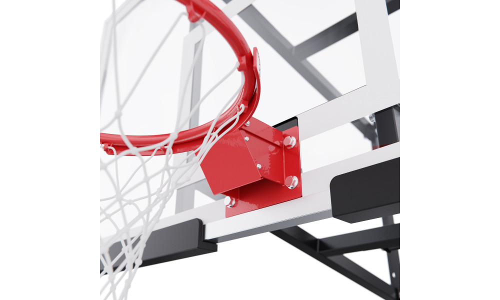 Щит изготовлен из прочного закалённого стекла толщиной 6 мм — материала, обеспечивающего отличный отскок мяча и устойчивость к ударам. Его размеры — 136 х 80 см, что делает его максимально приближенным к профессиональному оборудованию. Регулируемый вынос щита (51–55,5 см) повышает безопасность и удобство во время игры. Дополнительную безопасность обеспечивает защита Poly Pade, установленная по нижнему краю щита.