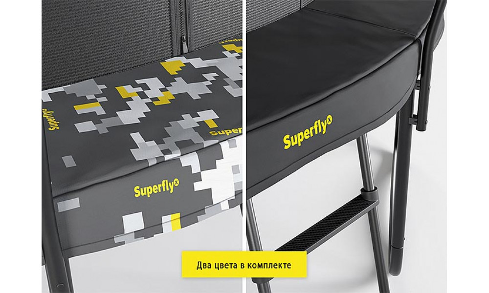 Внешний вид. Серия Superfly имеет двухсторонний защитный мат, то есть вы можете переворачивать мат и менять дизайн батута. В комплекте два цветовых решения: это Digital Como — он же цифровой камуфляж и Black classic или просто классический черный.